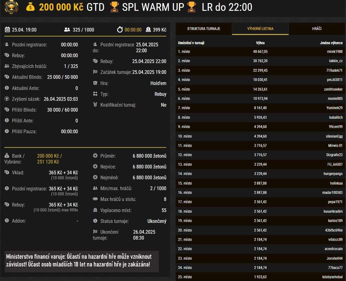 Druhá sada dubnové Synottip Poker Ligy začala pátečním Warm Upem s garancí nastavenou na 200 000 Kč. Buy-in 399 Kč našlo ve svých bankrolls 325 unikátních hráčů. Ti se činili a do konečného prize poolu vybrali 251 120 Kč.
