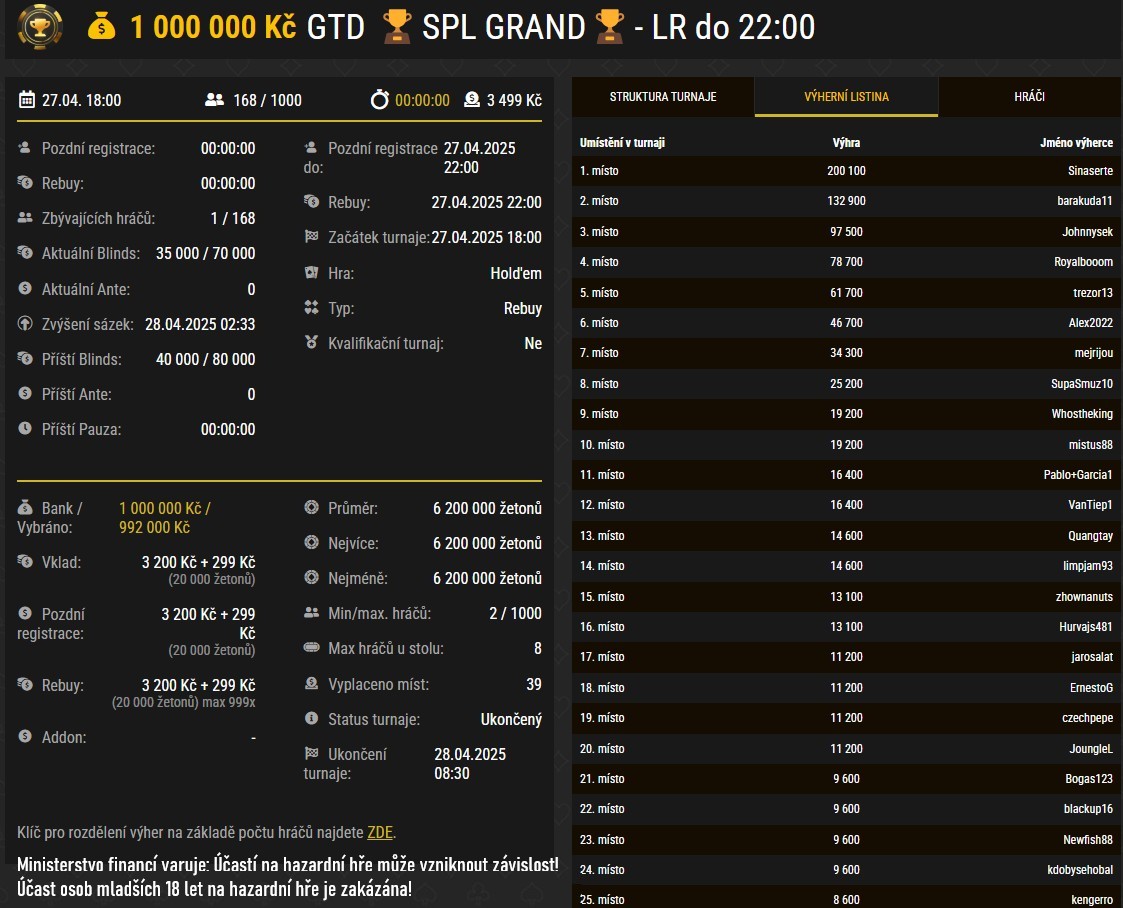 Výsledky online poker turnaje SPL s GTD 200 000 Kč. Zdroj pokerové lobby herny Synottip.cz