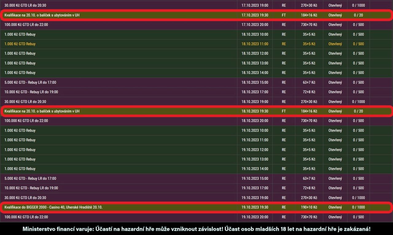 Vstup do turnaje v hodnotě 2.000 Kč lze získat již za 200 Kč v online poker turnajích o balíčky na Synottip.cz. Balíčky zahrnují mimo vstupu do turnaje i ubytování a All-in pásek, který vám zajistí free konzumaci na baru Casina 40. Turnaje o balíčky probíhají až do 19. 10. 2023. Každý den si můžete zahrát od 19:30 jednu kvalifikaci.
