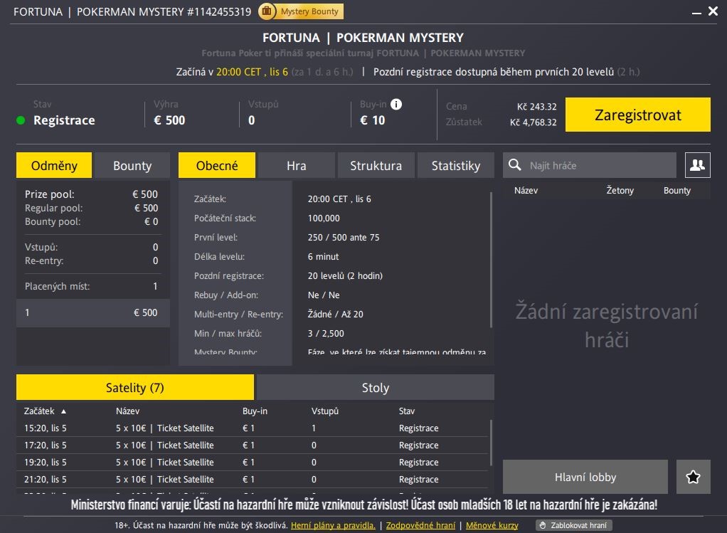 Parametry online poker turnaje FORTUNA POKERMAN MYSTERY