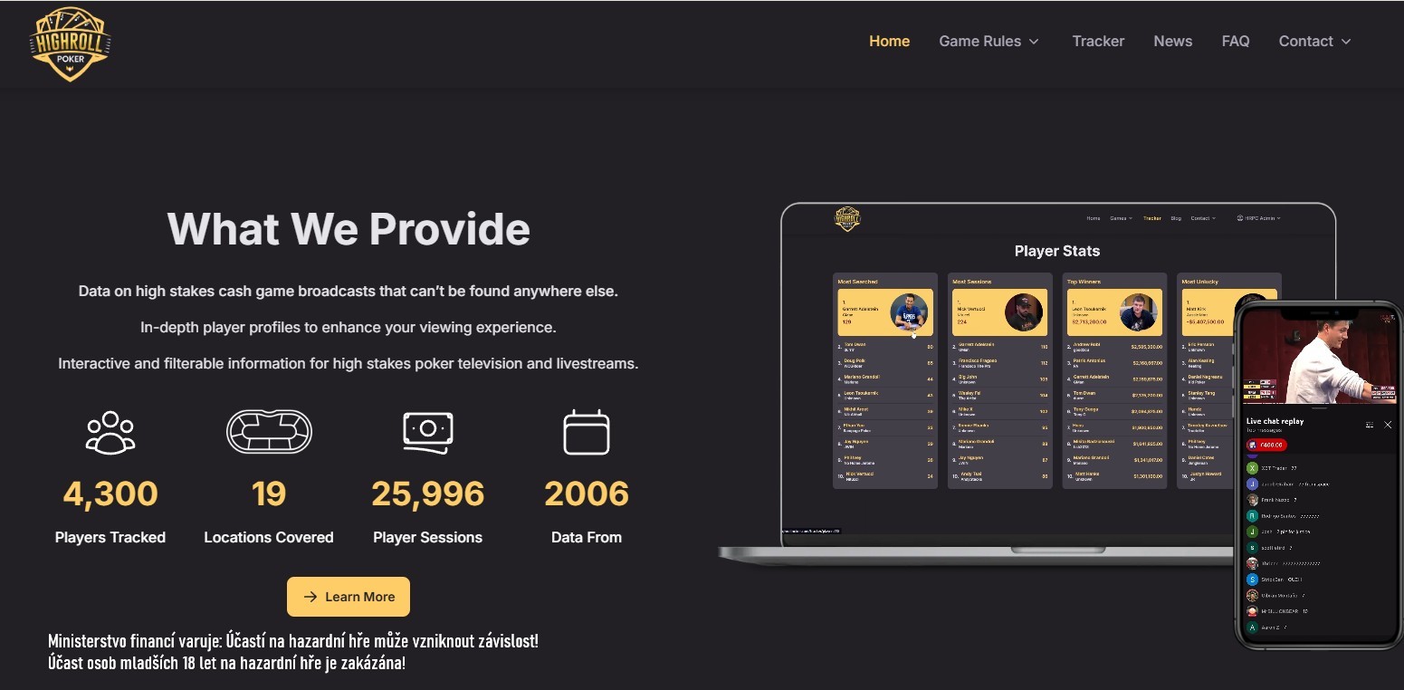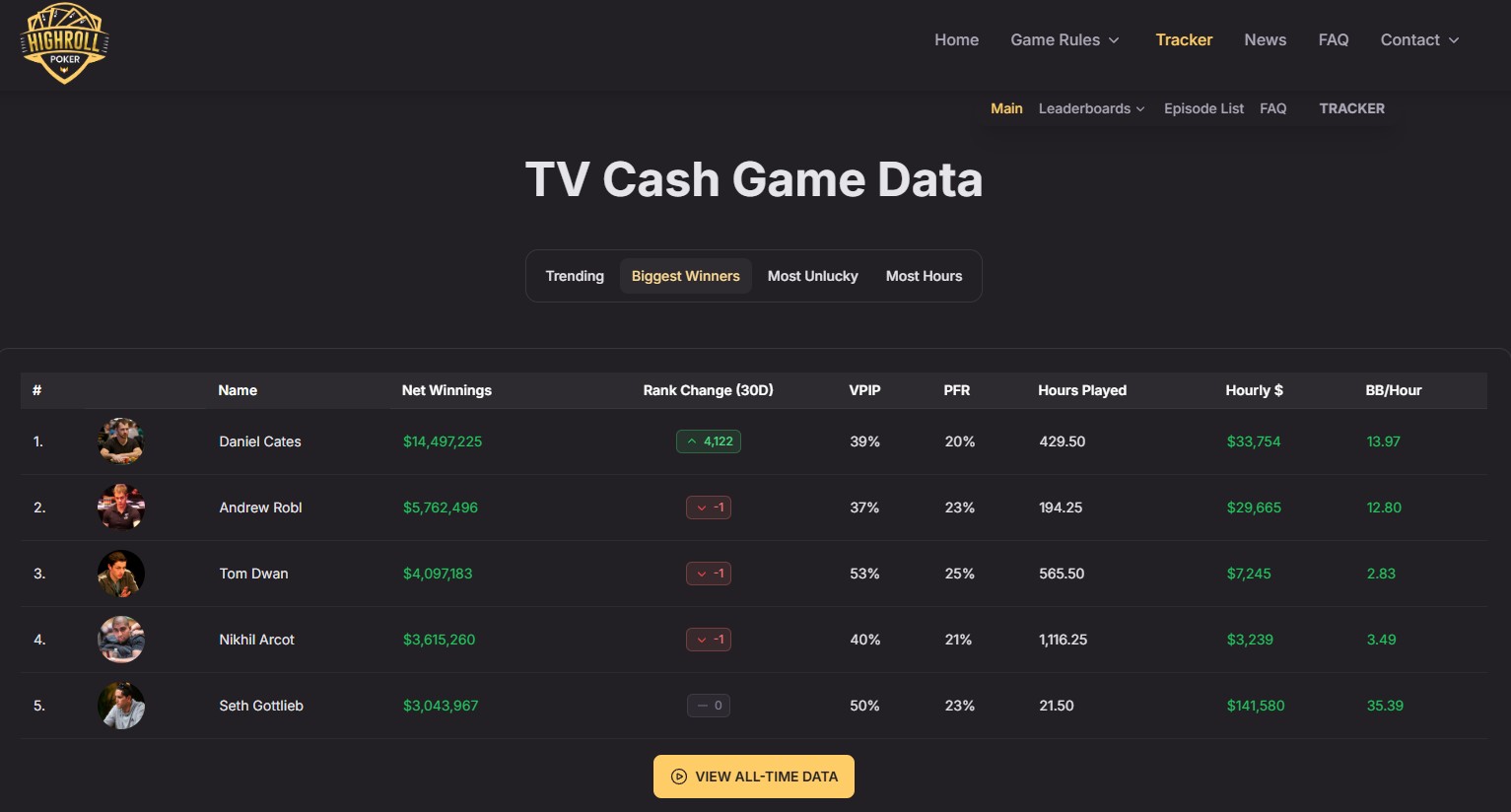 Web Highroll Poker trackuje výsledky z televizních high stakes cash games, ze kterých následně sestavuje statistiky a žebříčky. V současné době zde najdete data z TV cash games, jako jsou například: