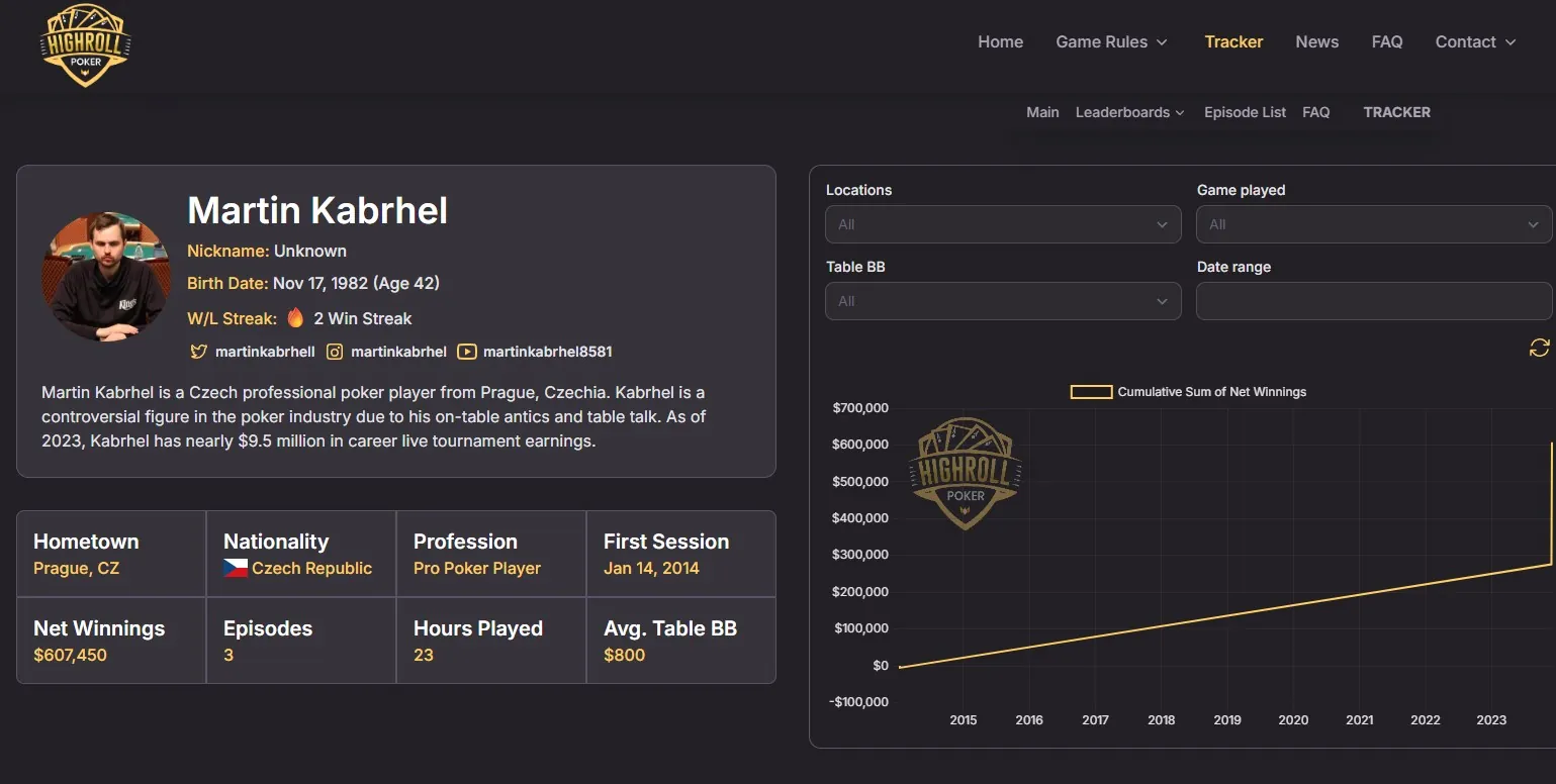Ukázka statistik u českého hráče Martin Kabrhela. Zdroj Highrollpoker.com