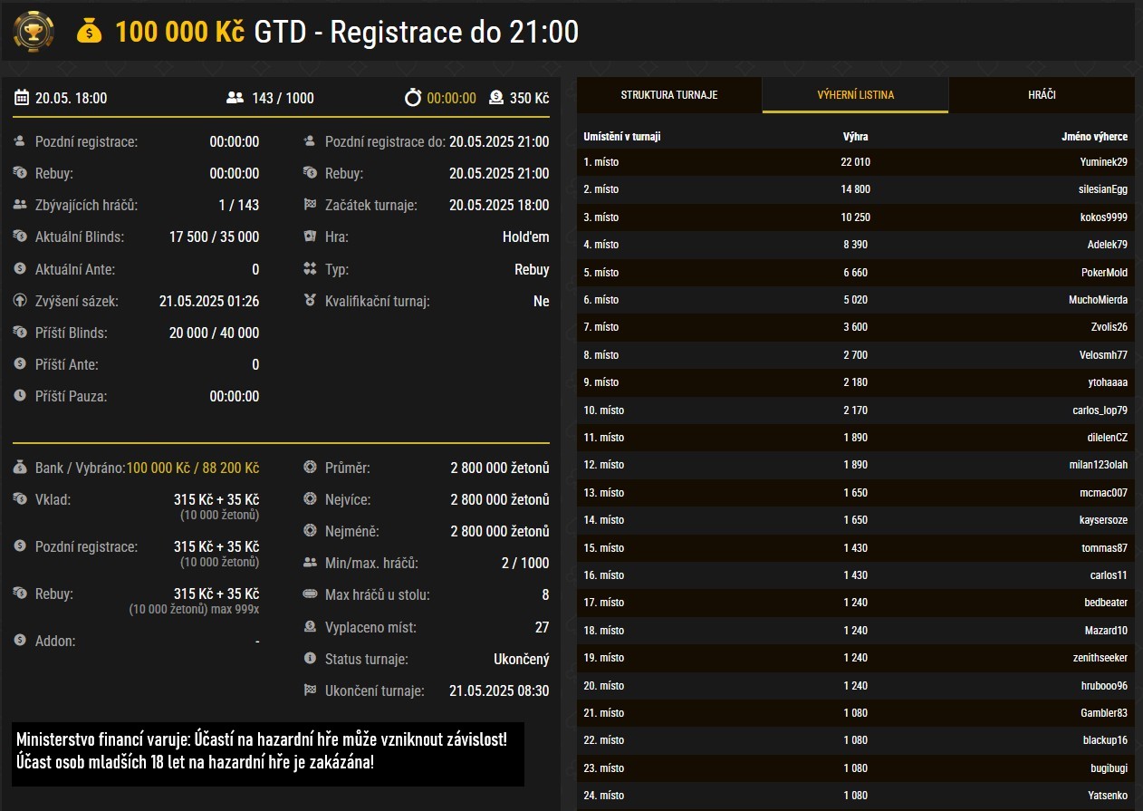 - Neděle 25. 5. 2025 – SPL GRAND, GTD 1 000 000 Kč, buy-in 3 499 Kč